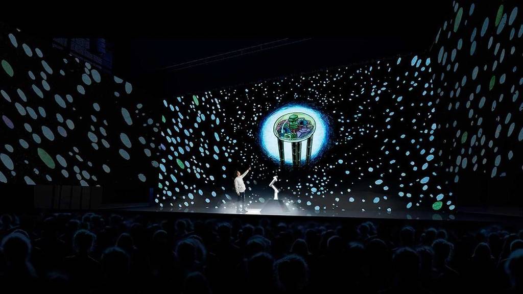 また、先端にカメラを備えたロボットアームが舞台のナビゲーターを務めるのも、他ではなかなか見ることのない演出だろう。まるで命が宿ったかのようなロボットアームがマンガのコマを追いながら、その視線を巨大LEDスクリーンへと映し出していく。